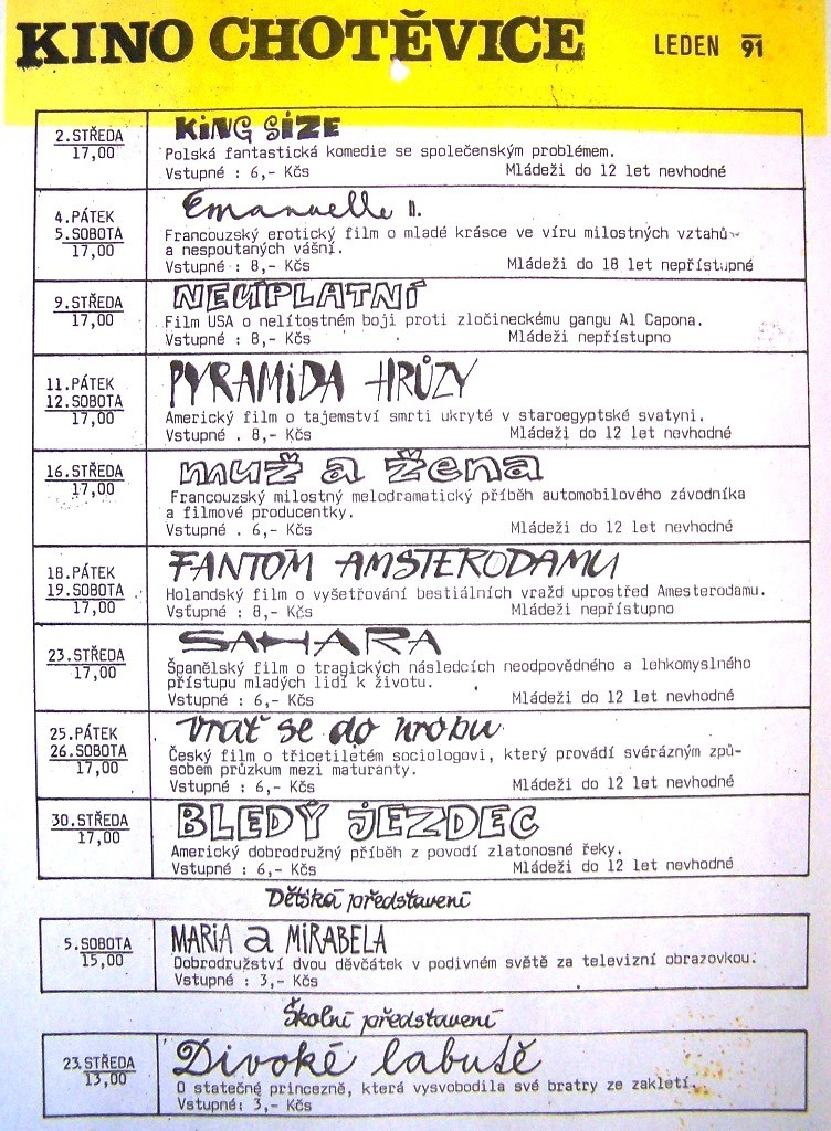 Jeden z posledních plakátů kina. Poslední promítání proběhlo v květnu roku 1991 ( to byly ceny za lupeny).